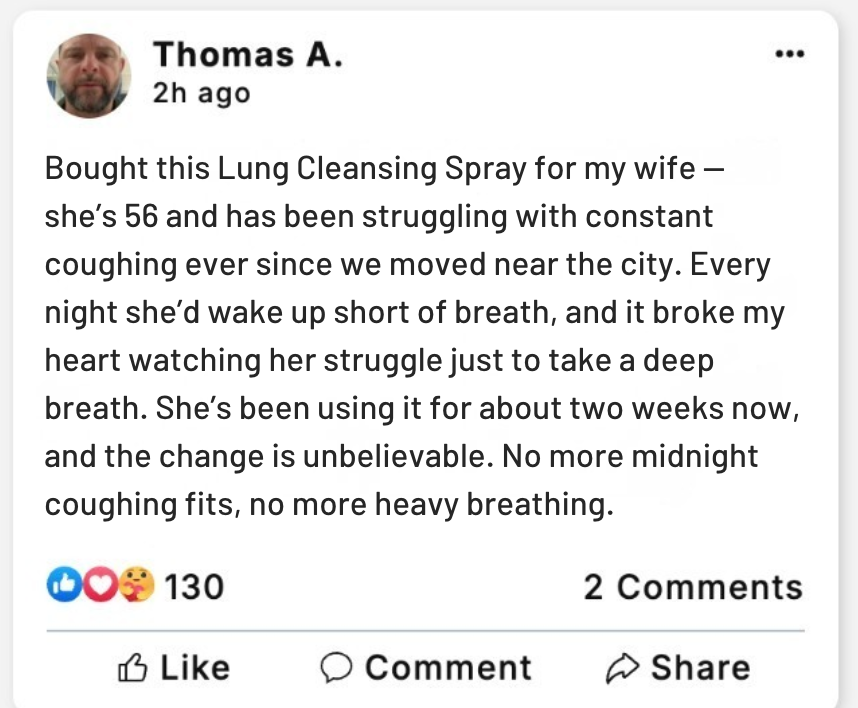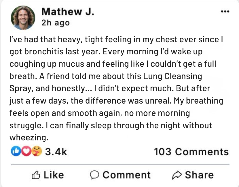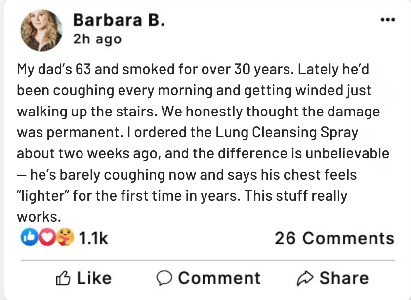 Sofia R. Oct 2025Verified BuyerI can finally breathe freely again!I’ve been using the Lung Cleansing Spray for about a month, and the difference is unbelievable. My chest used to feel tight every morning, and I’d cough endlessly before starting my day. Now I wake up breathing clearly with no heaviness at all. It feels like my lungs can finally expand again.